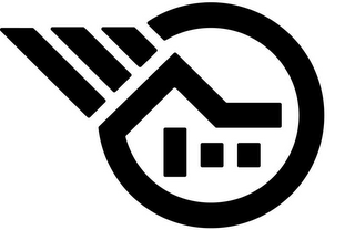 The mark consists of a broken circle with a line at the broken perimeter extending upward at an acute angle into the circle, turning downward at a right angle, then turning at an obtuse angle to form a roofline shape. One rectangle and two squares appear in the circle below the roofline shape representing a door and windows. Three parallel lines of descending length and perpendicular to the first line appear to the upper left of the break in the circle, representing rays from the sun.