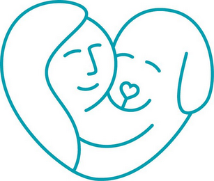 The mark consists of a woman's face and a dog's face. The woman has long hair and is to the left of the dog. The woman and dog appear to be hugging and form the shape of a heart. The entire mark is teal. The color white in the mark represents the background and is not claimed as a feature of the mark.
