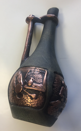 The mark consists of The colors are claimed as a feature of the mark. The mark is three-dimensional. The mark consists of a wine jug in the colors yellow, gray, black, and brass. The wine jug has three depictions in the colors gray, black, and brass. The jug is made up of clay and ceramic components and is painted. Each depiction is carved out and three-dimensional. Each depiction portrays a Georgian wine maker making, handling, and taking care of wine in a traditional Georgian wine cellar. Each depiction contains a hole-like structure in the ground, which is an underground, cavernous space where the Georgian wine is made. The wine jug's handle is a depicted as a textured grape trunk or branch, connected to the wine jug with thick twine. The wine jug handle is gray, black, and brass. The white in the depiction represents a transparent area and is not part of the mark.
