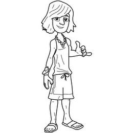 The mark consists of the design element of a young male surfer wearing a shirt, swim trunks and sandals; and around his neck a necklace, and around his wrist a bracelet.