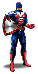 The mark consists of a design of a superhero dressed in a red, blue, silver, white and black outfit, including a blue and red mask. The outfit features a red "V" shape, which looks like a snake. This "V" contains some black and white marks. The superhero is holding a silver, white and red shield. There are black streaks and lines throughout the outfit and shield design. The face of the superhero appears in tan, and the eyes and mouth of the superhero contain white. There are black lines representing facial features on the face of the superhero. There is a black shadow under the superhero's feet.