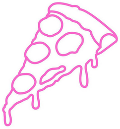 The mark consists of a pink outlined image of a slice of pizza with circular toppings and drips of cheese. The color white represents background, outlining, shading and/or transparent areas and are not part of the mark.
