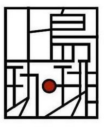 The mark consists of a rectangle enclosing stylized Japanese characters. A red circle outlined in black is an element of the characters. All of the other elements are black.