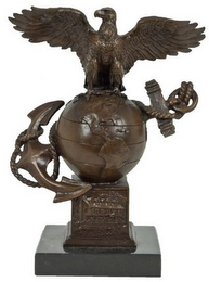The mark consists of an eagle perched atop a globe, through which an anchor is inserted an anchor with the anchor line wrapped around the tines of the anchor. This configuration sits atop a base or pedestal on the face of which is a depiction of an 18th century tavern.