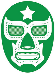 The mark consists of the following: a green Mexican wrestler mask, with a five points star on the top, frames rounding the eyes, nose and lips. Over the frame is a dotted line framing the eyes, nose and lips. A dotted net covering the eyes area, a hole for the nose and a hole for the lips. The white areas in the mark are not claimed as a feature of the mark, and are intended to show background or transparent areas only.