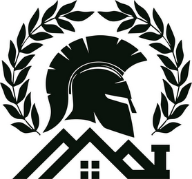 The mark consists of a stylized warrior helmet, a stylized laurel branch on the left of the helmet, a stylized laurel branch on the right of the helmet, and a stylized top section of a house below the helmet with a roof outline, a window outline and a chimney outline.