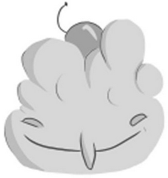 The mark consists of cartoonish serving of whipped cream. The bottom is smooth with a face depicted on it, while the upper portion has five billowing puffs of cream. The two center puffs are circular, larger, and sit higher than the other puffs. Two curved vertical lines are drawn below the center puffs giving the impression of a creased forehead. The face consists of two small half-moon shaped eyes, flat sides down, that sit above the ends of a pencil thin mouth that runs from one side of the cream to the other and is turned upwards at the ends giving an impression of a smile. The mouth is intersected in the middle with a carrot-like nose that is a three-quarter vertical ellipse pointed at the bottom. A cherry-like bomb sits atop the center of the whipped cream. The twine-like stem is curved upwards and there is a marking on the round portion.
