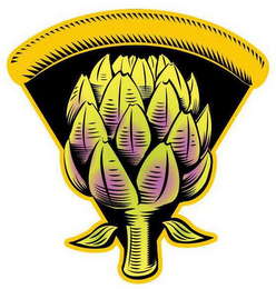 The mark consists of a design of a stylized green artichoke with purple shading. This artichoke design appears in front of a stylized design of a slice of pizza. The pizza crust is yellow with black triangular patterns and the rest of the pizza slice is black. This entire design is outlined in yellow.