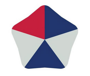 The mark consists of a stylized pentagon design divided into five sections, two of which are in blue, two of which are in grey, and one of which is in red.