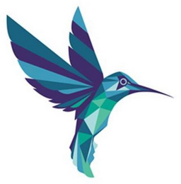 The mark consists of a hummingbird with different colored facets within the body of the bird. The wings of the hummingbird consist of purple, dark blue, blue, and light green alternating facets. The torso and face of the hummingbird consist of dark green, light green, light blue, purple, blue, and dark blue alternating facets. The profile of a human face is outlined extending from the tip of the beak to the bottom of the tail.