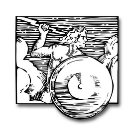 The mark consists of a stylized man holding a raised lightning bolt spear and circular shield.
