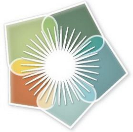 The mark consists of a five sided pentagon shape divided into five sections, each of which has its own color of dark green, light green, light blue, blue or red, with a white starburst in the middle of the pentagon with five petals, each of which is outlined in white, and thin, short, white lines radiating from the center of the pentagon.
