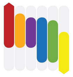 The mark consists of a stylized scale design comprised of six colored tabs being depicted from left to right in the colors red, orange, purple, blue, green and yellow. The top of the left most tab and the bottom of the right most tab form a point. The gray areas in the drawing represent background and/or transparent areas and are not part of the mark.