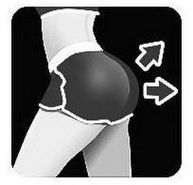 The mark consists of the backside of a woman's silhouette with shorts with two arrows, one pointing up and the other pointing horizontally from the woman's derrière. The image is on a shaded square with rounded edges.
