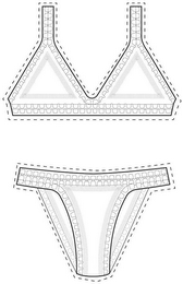 The mark consists of a pattern of non-uniform rectangles forming strips that outline the edges of a bikini top and bikini bottom; the strips of rectangles have small lines extending onto the fabric of the bikini top and bikini bottom. The rectangular strips are also placed on the straps of the bikini top and bikini bottom, extending from the front to the back of both pieces of the swimsuit. The broken lines in the drawing represent the placement of the mark on the goods and does not represent a feature of the mark.