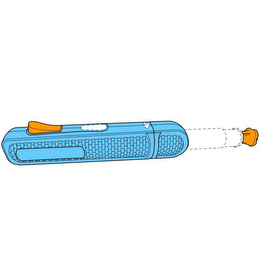 The mark consists of the colors blue and orange as used on an automatic drug injector. The color blue appears on the barrel of the injector. The color orange appears on the needle shield cap and injection button of the injector. The dotted lines shown on the three-dimensional drawing are for positioning only and do not comprise a feature of the mark.