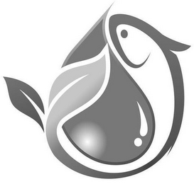 The mark consists of a geometric impression of a fish wrapped around a water drop. The tail of the fish transitions into a geometric impression of two leaves.
