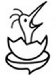 The mark consists of a stylized image of a bird's profile facing to the right with its mouth open inside an image of a broken eggshell perched atop a stylized nest.