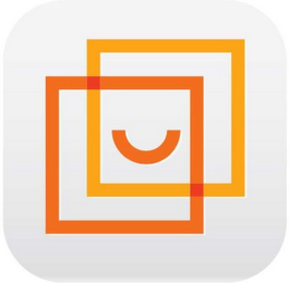 The mark consists of an orange line forming the shape of a square with a yellow-orange line forming the shape of a second square overlaying the first at a 45-degree offset to its upper right, with an orange line in the shape of a half circle open to the top in the shape of a smile in the middle of the square space formed by intersections of the two squares, all on a gray square background with rounded corners and a vertical gradient that is darker at the bottom.
