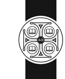 The mark consists of a design of a Greek cross with flared flat ends, with four book icons set between the four arms of the Greek cross, and the Greek letters alpha and omega set in the middle of the Greek cross, all encircled by a circular line and set against a vertical band.
