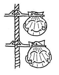 The mark consists of the design of two scallop shells hanging from pins that have been inserted through a rope. The shells have a smiling face and hand design.