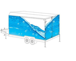 The mark consists of an image of a body of water with a surface showing the water in motion, and with air bubbles and different shades of blue, along with white reflection highlights, in the water and on the bubbles. The outline of the trailer, the trailer hitch, the trailer wheels, the trailer undercarriage and the supporting posts on the undercarriage, the trailer doors, the frame around the trailer doors, and the door hinges and door lock all appear in dotted lines in order to show the placement and position of the mark and are not claimed features of the mark