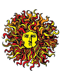 The mark consists of yellow face at center of image with black facial features; black outline of face; red bands extending from center of image with black outline; yellow bands extending from center of image with black outline; orange bands extending from center of image with black outline.