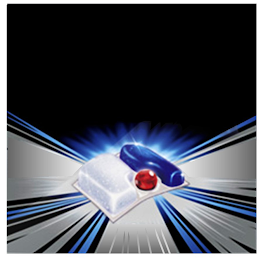The mark consists of the design of a dishwasher pod consisting of a blue irregular rectangle with light blue and white highlights next to a red sphere with black shadows and white highlights next to a white and grey speckled irregular rectangle. The dishwashing pod is displayed in the center of a starburst composed of grey, blue, white and green rays beneath a black field.