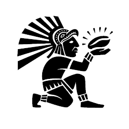 The mark consists of of the representation of a mythological being with a headdress featuring an eagle and feathers, holding a stylized coffee bean.
