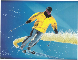 The mark consists of a male skier with a pink face wearing blue and black pants, a blue and black hat, black boots, black skis, black gloves, black goggles, and a yellow and black parka. He holds white and black ski poles. He appears on a blue background. Curved lines of yellow, white, and blue appear between his waist and his feet. White snowflakes appear on the background.