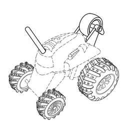 The mark consists of a three-dimensional configuration of an elevated wheel that extends upward and is angled away from the body of the vehicle at a position near the top of the rear side of the body of the vehicle, an elevated rod that extends upward and is angled away from the body of the vehicle at a position near the top of the front side of the body of the vehicle, two back wheels positioned below the rear base of the body of the vehicle, each of the back wheels having a tire tread design consisting of a series of alternating parallel chevron stripes where one half of each chevron stripe is sunken and the other non-sunken half includes two raised buttons, each of the back wheels having a tire rim design consisting of eight straight spokes, two front wheels smaller in size than the two back wheels where the two front wheels are positioned below the front base of the body of the vehicle, each of the front wheels having a tire tread design consisting of a series of alternating parallel chevron stripes where one half of each chevron stripe is sunken and the other non-sunken half includes three raised buttons, each of the front wheels having a tire rim design consisting of twelve spiraled spokes. The vehicle body and vehicle chassis are not part of the mark and are shown in broken or dotted lines.