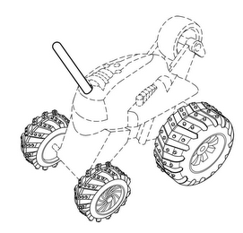The mark consists of a three-dimensional configuration of an elevated rod that extends upward and is angled away from the body of the vehicle at a position near the top of the front side of the body of the vehicle, two back wheels positioned below the rear base of the body of the vehicle, each of the back wheels having a tire tread design consisting of a series of alternating parallel chevron stripes where one half of each chevron stripe is sunken and the other non-sunken half includes two raised buttons, each of the back wheels having a tire rim design consisting of eight straight spokes, two front wheels smaller in size than the two back wheels where the two front wheels are positioned below the front base of the body of the vehicle, each of the front wheels having a tire tread design consisting of a series of alternating parallel chevron stripes where one half of each chevron stripe is sunken and the other non-sunken half includes three raised buttons, each of the front wheels having a tire rim design consisting of twelve spiraled spokes. The vehicle body, vehicle chassis and elevated wheel that extends upward and is angled away from the body of the vehicle at a position near the top of the rear side of the body of the vehicle are not part of the mark and are shown in broken or dotted lines.