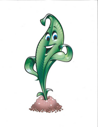 The mark consists of a stylized design of a leafy plant in shades of green and white outlined in black, sprouting up from brown dirt outlined in black with white and light green star images. The plant has two leaf arms, two smaller bottom leafs, and a face with blue, black, and white eyes, black eyebrows, and an open, smiling shaded green mouth showing white teeth outlined in black. The white appearing in the drawing and not otherwise specified above represents background only is not a feature of the mark.