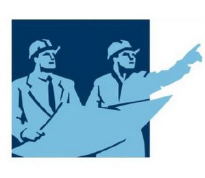 The mark consists of a square in dark blue, with the depiction of two construction workers wearing construction helmets in light blue with dark blue outlining that are standing side by side and holding construction plans in light blue with dark blue outlining, with the worker on the left having a dark blue tie, and the worker on the right pointing upward, set inside the square, with one arm of the pointing construction worker set forth outside the square.
