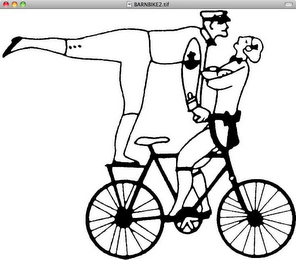 The mark consists of A pair of gymnasts -- a man in uniform and a woman dressed as a flapper in 1920's style balancing and riding backwards on a bicycle.