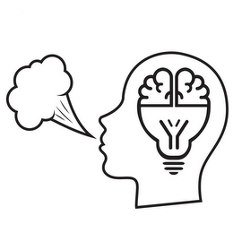 The mark consists of a profile of a man's head blowing a cloud of vapor. The profile is from the neck up and includes detail of the mouth, lips, nose, and chin. Inside the man's head is a brain attached to and above a light bulb design.