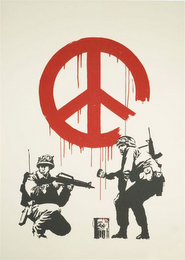 The mark consists of two soldiers in military wear outlined in black. One soldier is holding a gun while the other soldier is holding a paint brush. There is a can of paint outlined in black with a touch of red at the top situated between the two soldiers. A large red peace sign appears behind the soldiers. There is red paint dripping from the peace sign. The soldiers and the peace sign are set against a tan background.