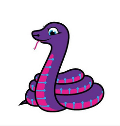 The mark consists of a stylized snake outlined in the color black, its head and body being in the colors purple, pink and light blue, its eye being in the colors black, white and light blue, its tongue in the color pink.