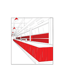 The mark consists of a three-dimensional configuration of trade dress for the interior design of a restaurant/bar comprising a bar area, in which the wall enclosed by the bar is divided into four rectangular sections by three vertical square-shaped columns, each section being comprised of two rectangular pieces of corrugated steel arranged along the lower part of the section and illuminated by red lighting, with the tabletop base upon which the tabletop bar sits being comprised of vertically aligned, evenly spaced, rectangular slats in a distressed appearance and illuminated by red lighting, and six overhanging lights with the lightshades in the color red. There are three inverted industrial style U shaped fixtures on the tabletop of the bar. Each U shaped fixture comprises two plumbing elbow plumbing parts at opposite ends of the U, a horizontal plumbing type pipe joining the two elbows of each fixture, and two vertical plumbing type pipes extending from each elbow part of each fixture to the tabletop. The broken lines depicting the shelf that divides the corrugated steel in each section, and the flat tabletop bar indicates placement of the mark for the services and are not part of the mark.