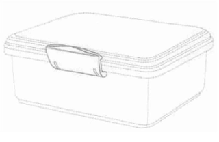 The mark consists of the three-dimensional configuration of the exterior surface of the clasp on the outside of a container. The clasp has a nearly rectangular shape as viewed from the front and features a concaved curved top, vertical sides that slant inward from the top to the bottom, a straight horizontal bottom, and an indented ridge running horizontal along the upper portion of the clasp. The container itself, which is depicted in broken lines, is not claimed as part of the mark and only serves to show the position or placement of the mark on goods.