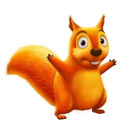 The mark consists of a squirrel character. The squirrel is facing slightly to its left with its arms outstretched, its ears perked up, and its eyes wide open. The eyes are white, gold, and black. Its fur is a blend of yellow, orange, and gold colors. The eyebrows, nose, and claws are brown. The squirrel has a slight smile with two white front teeth showing.