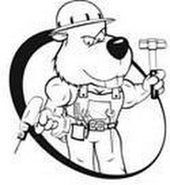 The mark consists of an image of a standing gopher with large muscles inside of a slanted circle. The gopher is wearing work overalls with a tool belt and a hard hat. The gopher is holding a hammer in the left arm and a drill in the right arm.
