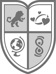The mark consists of a stylized shield sectioned into four quadrants. The upper left corner consists of a stylized lion standing on its two hind legs. The upper right corner consists of circular ring-like structure surrounded by three stylized hearts. The bottom left corner consists of a stylized globe situated within a stand. The bottom right corner consists of a stylized figure eight.