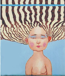 The mark consists of the stylized depiction of a nude woman from the chest up. The woman is shown in the color nude, with the outline of the features of the woman shown in brown. The woman is shown with pink lips, pink cheeks, and blue eyeshadow. The woman is shown with hair extending from the top of her head in brown and cream. A horizontal blue line appears toward the top of the woman's hair. The entire mark appears upon a blue background.