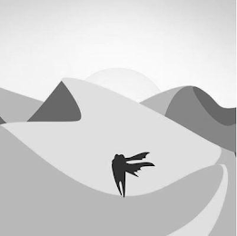 The mark consists of a desert landscape of three sand dunes in the foreground with a silhouette of an individual walking along the ridge of the middle dune. Centered in the background is a setting sun.