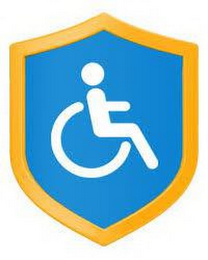 The mark consists of a shield, with a white International Symbol of Access inside that shield. The inner part of the shield is blue, with a yellow border.