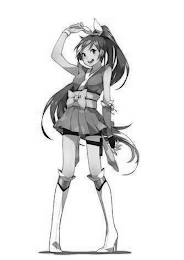 The mark consists of a female anime character with bangs and a long flowing pony tail with a fanciful hair tie attached to it, with her right hand holding the fanciful hair tie and wearing a wristband; on her left arm she is wearing a fingerless elbow-length glove with ribbon tied around the elbow, wearing a pleated sleeveless top with a kimono-styled bow ribbon belt tied around her waist with part of the belt hanging down behind her legs, wearing biker shorts partially seen, wearing a holster on her left thigh and knee-high high-heeled boots.