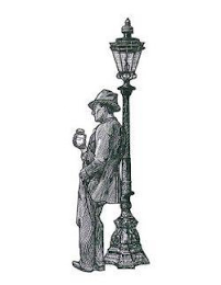 The mark consists of The image of a man in a suit leaning up against a light post holding a jar in black and white.