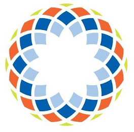 The mark consists of a mosaic of yellow, three-sided and orange, blue and light blue, four-sided shapes arranged in a circular pattern with the yellow shapes positioned on the outer most edge, followed inside by a ring of the orange shapes, then the blue shapes, and the light blue shapes on the inner most ring position. The color white represents background or transparent areas, and is not claimed as a feature of the mark.