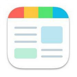 The mark consists of a square with rounded corners with a strip across the top comprised of four rectangles in the colors, from left to right, red, yellow, green and blue. Below the strip that are two columns in which appear three lines in gray and a rectangle in light green with rounded corners in the left column, and a light blue square with rounded corners above two gray lines in the right column. The background of the square is white and a gray shadow appears around the outside edge of the mark.
